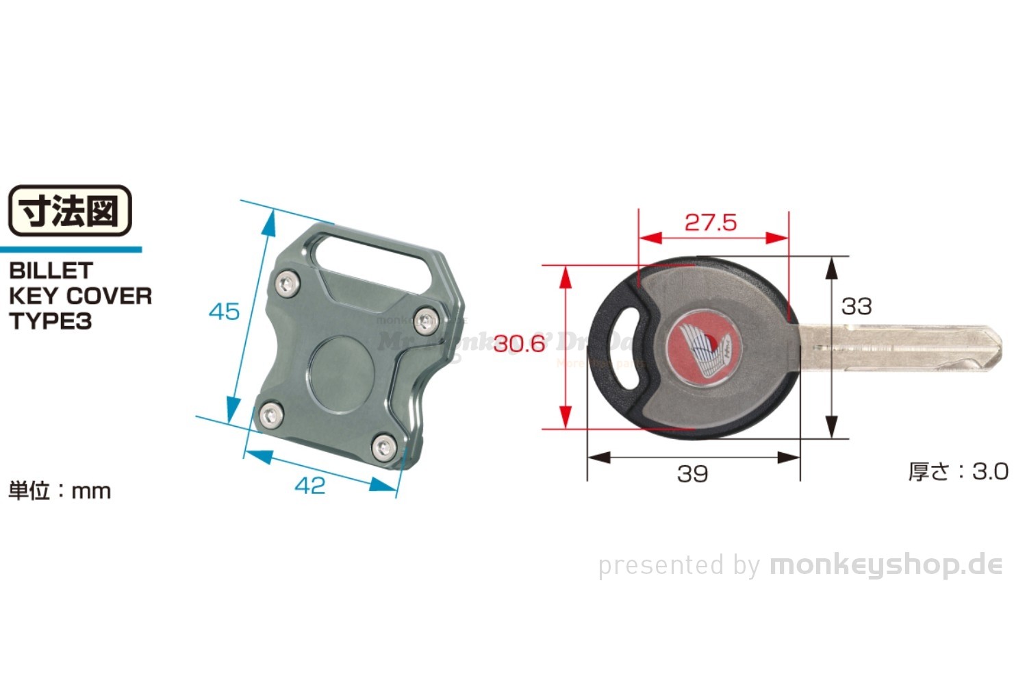 Hochwertiges KITACO Schlüssel Gehäuse aus CNC gefrästem, rot eloxiertem Aluminium passend für den Schlüssel sämtlicher Honda Monkey 125 Modelle.