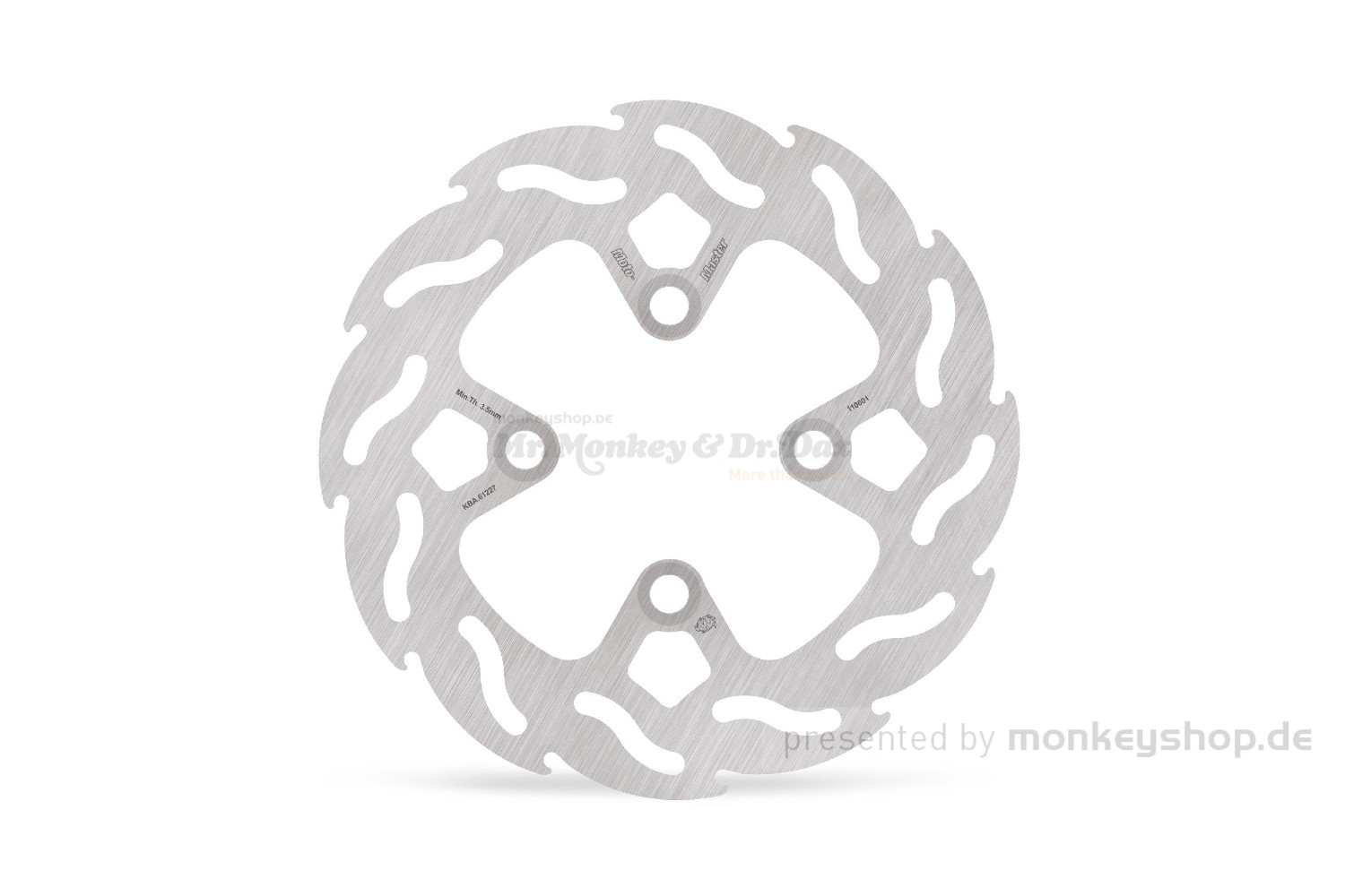 Bremsscheibe von Moto-Master für die hintere Scheibenbremse der Honda Monkey 125 (JB02 Euro4 / JB03 Euro5 / JB05 Euro5+), Honda MSX 125 (alle Modelle einschl. JC92A GROM) und Honda Dax 125 (JB04 Euro5 / JB06 Euro5+). Mit Zulassung/TÜV/ABE für den deutschen Straßenverkehr.