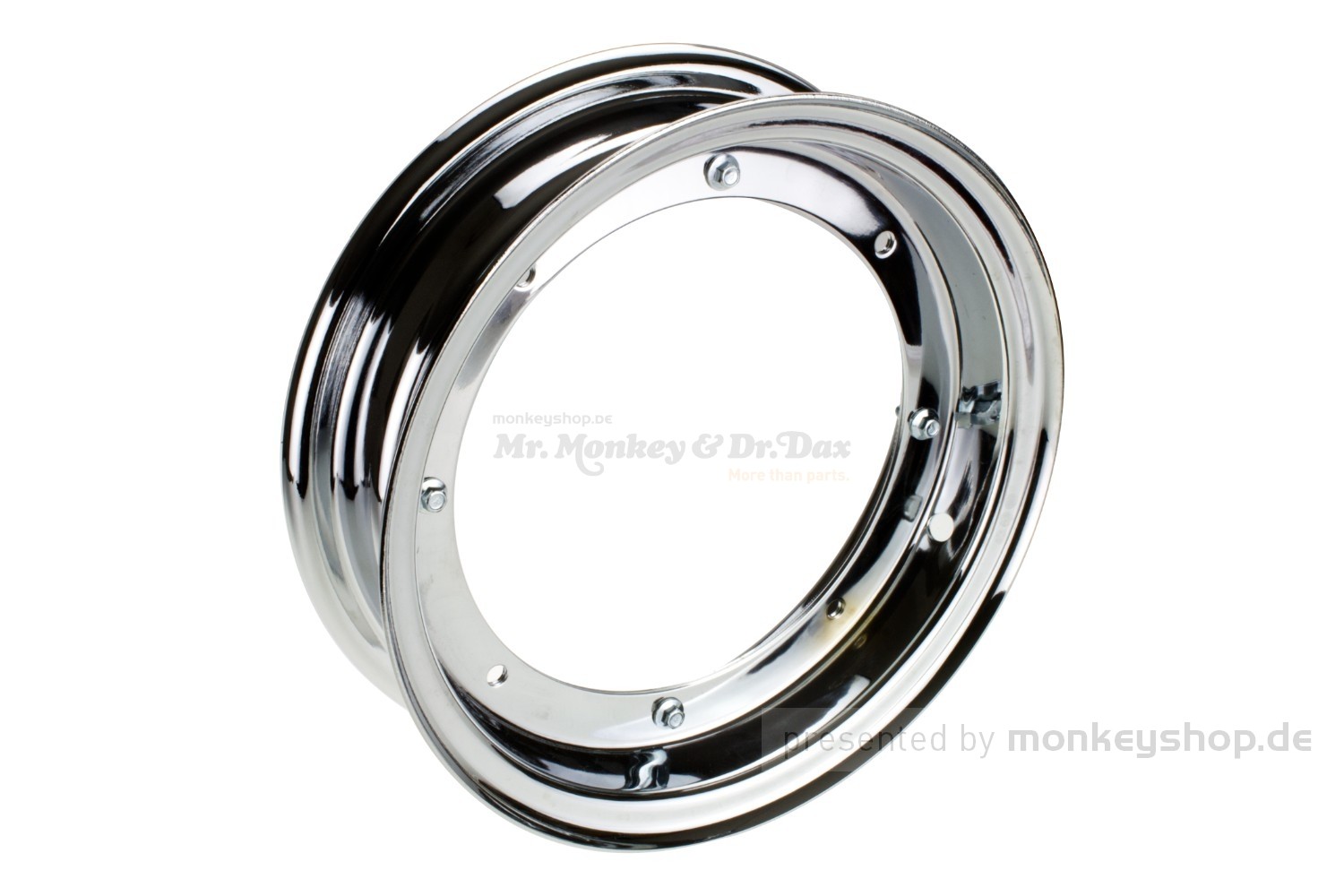 Zweiteilige Stahl Felge 2.75x10 in verchromter Ausführung. Passend für Honda Dax 50 70 und Replika Naben mit 4 Loch Befestigung. (Felgenstern mit 4 "Armen")