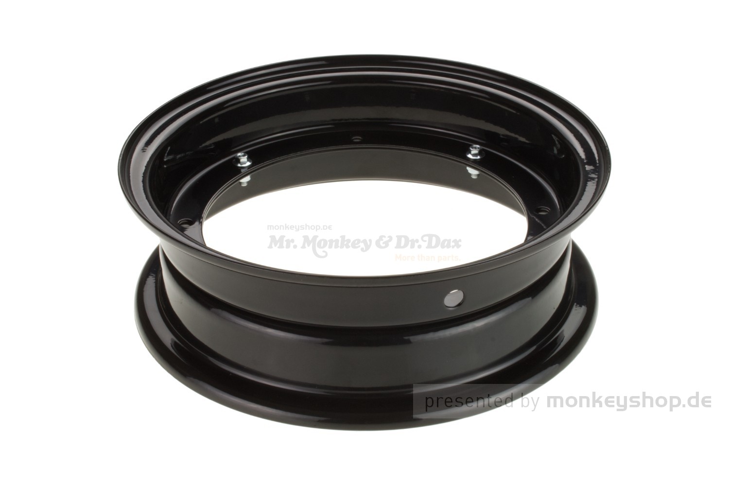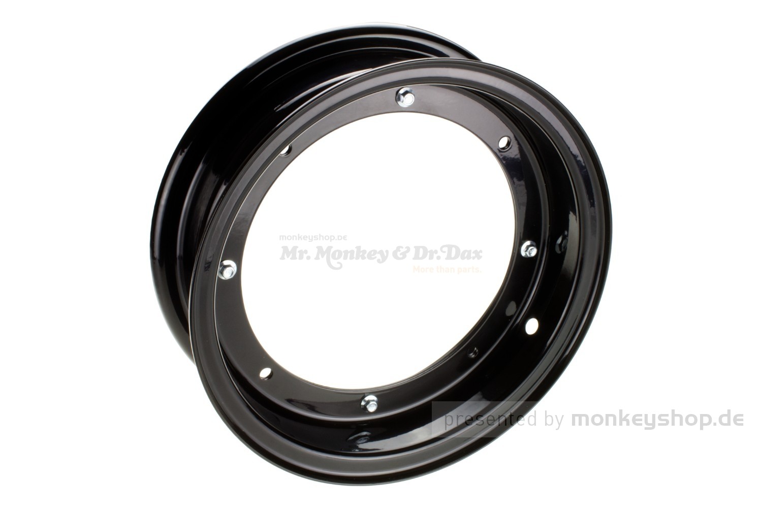 Zweiteilige Stahl Felge 3.00x10 in schwarzer Ausführung. Passend für Honda Dax 50 70 und Replika Naben mit 4 Loch Befestigung. (Felgenstern mit 4 "Armen")