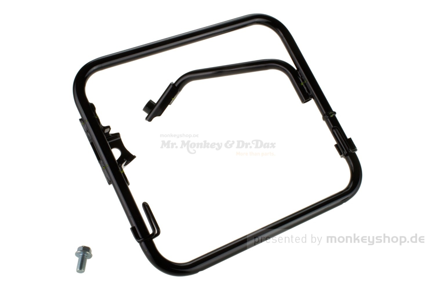 Schwarze Taschenhalterung von HONDA für Packtaschen auf der linken Seite die so nicht am Stoßdämpfer oder der Karosserie schleifen. Passend für die Honda Monkey 125 (JB02 / JB03 / JB05).