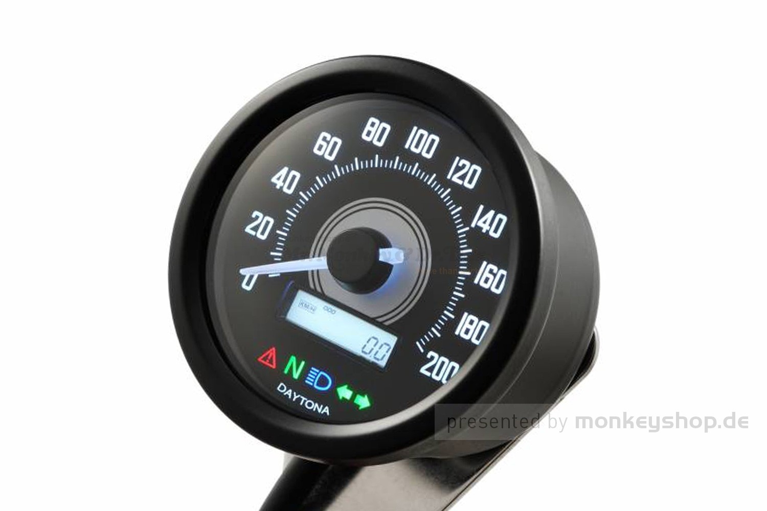 Daytona Velona ø60 Tacho bis 200 Km/h mit Kontrollanzeigen in schwarz.