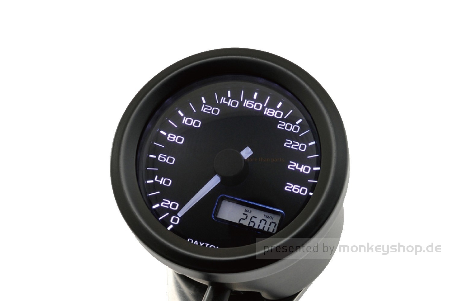 Daytona Velona ø48 Tacho bis 140 Km/h in schwarz. Drei einstellbare LED-Hintergrundbeleuchtungen. (Orange, Blau und Weiß)