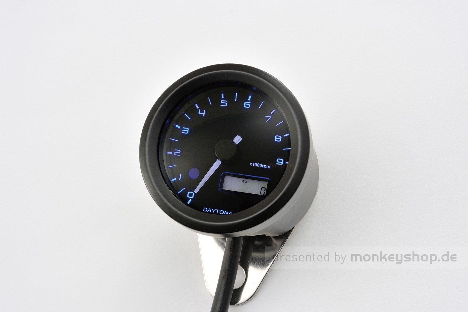 Daytona Velona ø48 Drehzahlmesser bis 9.000 U/min RPM in schwarz. Drei einstellbare LED-Hintergrundbeleuchtungen. (Orange, Blau und Weiß)