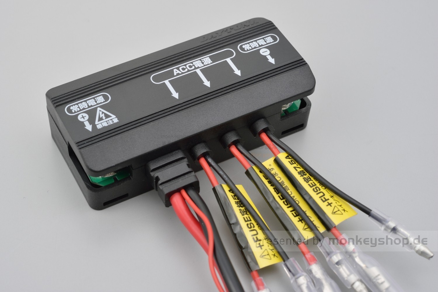 Mit diesem kompakten DAYTONA "D-UNIT PLUS" 4-Port Zubehör-Stromverteiler lassen sich sowohl zündungsabhängige Verbraucher (ACC) als auch dauerhafte Stromabnehmer (Konstantstrom / Dauerplus) zentral und sicher an das Bordnetz anschließen.
