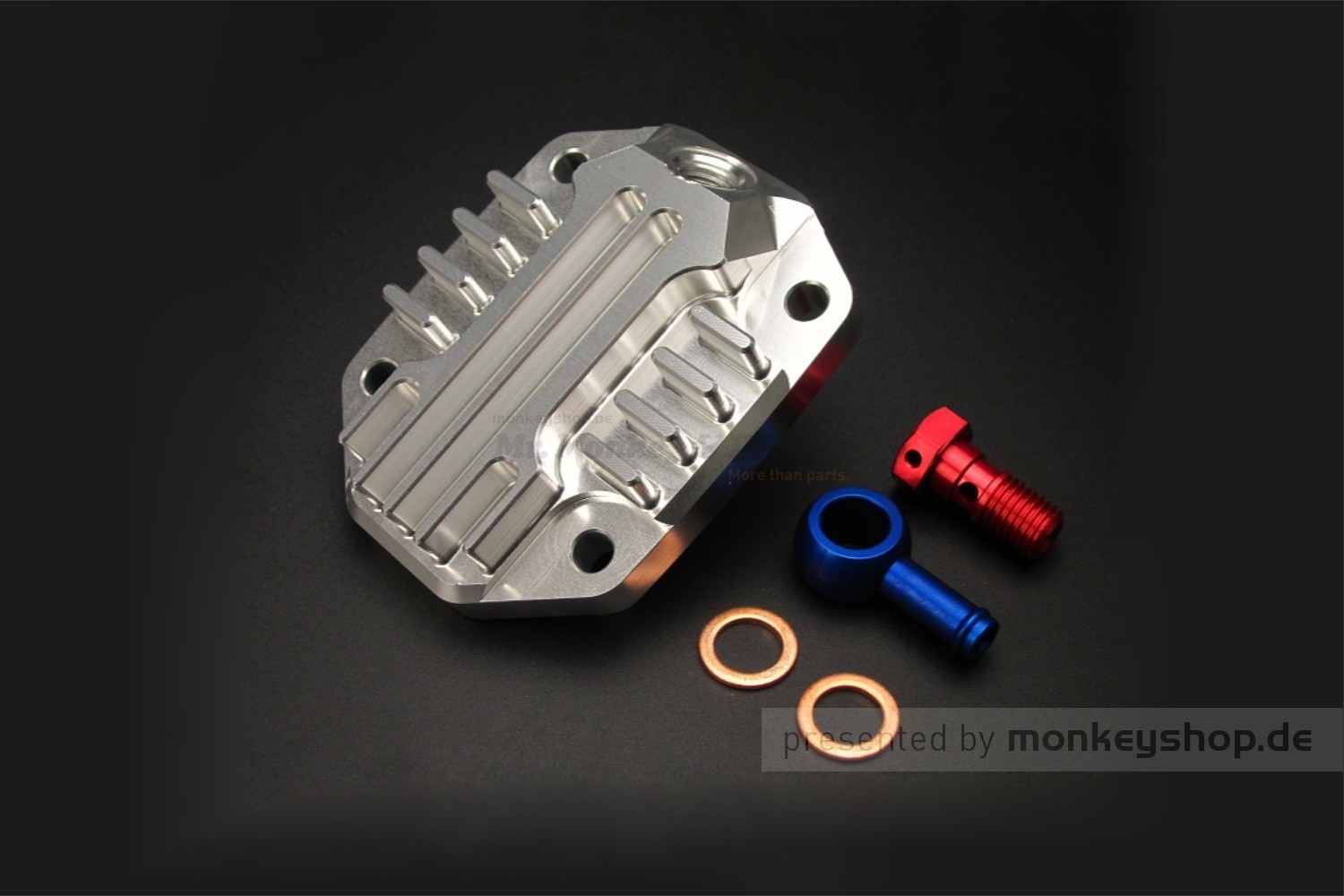 Hochwertiger Zylinderkopf Deckel aus silber eloxiertem Aluminium CNC gefräst mit 10mm Anschluss für Motorentlüftung passend für sämtliche Honda Monkey 50, Honda Gorilla, Honda Dax 50/70, Honda Chaly und Honda SS50 Modelle und sämtliche Replika Motoren mit Honda Stehbolzenabstand.