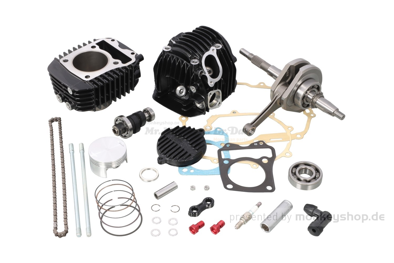 Kitaco NEO Big Bore Kit in schwarz mit 181cc Aluminium Zylinder mit Stahlbuchse, 2 Ventil SOHC Zylinderkopf, geschmiedetem Aluminium Kolben, Rennkurbelwelle, scharfer Nockenwelle und weiterem Zubehör.