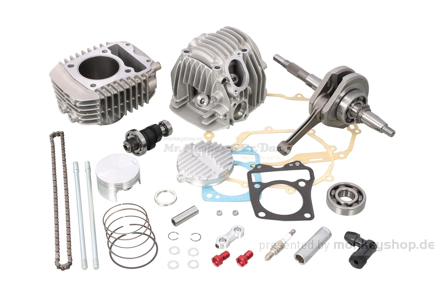 Kitaco NEO Big Bore Kit in silber mit 181cc Aluminium Zylinder mit Stahlbuchse, 2 Ventil SOHC Zylinderkopf, geschmiedetem Aluminium Kolben, Rennkurbelwelle, scharfer Nockenwelle, Einspritzdüse und weiterem Zubehör.