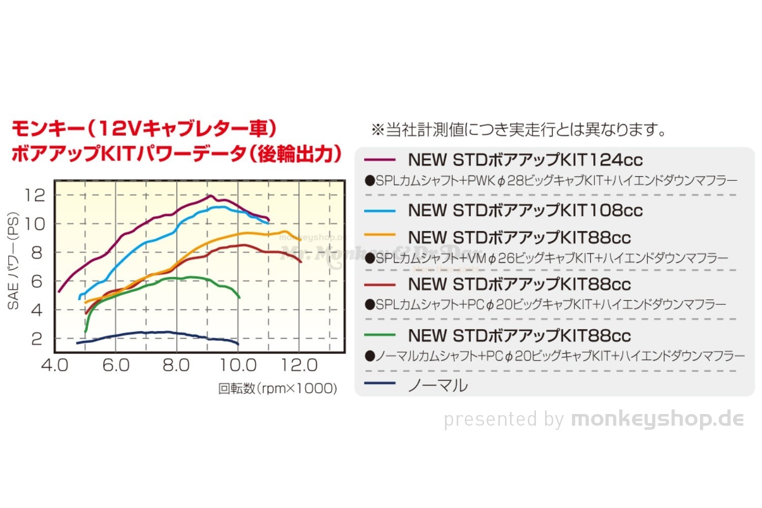 - Die orange Kurve zeigt die Leistung eines Kitaco 88cc mit Nockenwelle in Verbindung mit einem Mikuni VM26 Vergaser und einem offenen Sportauspuff.