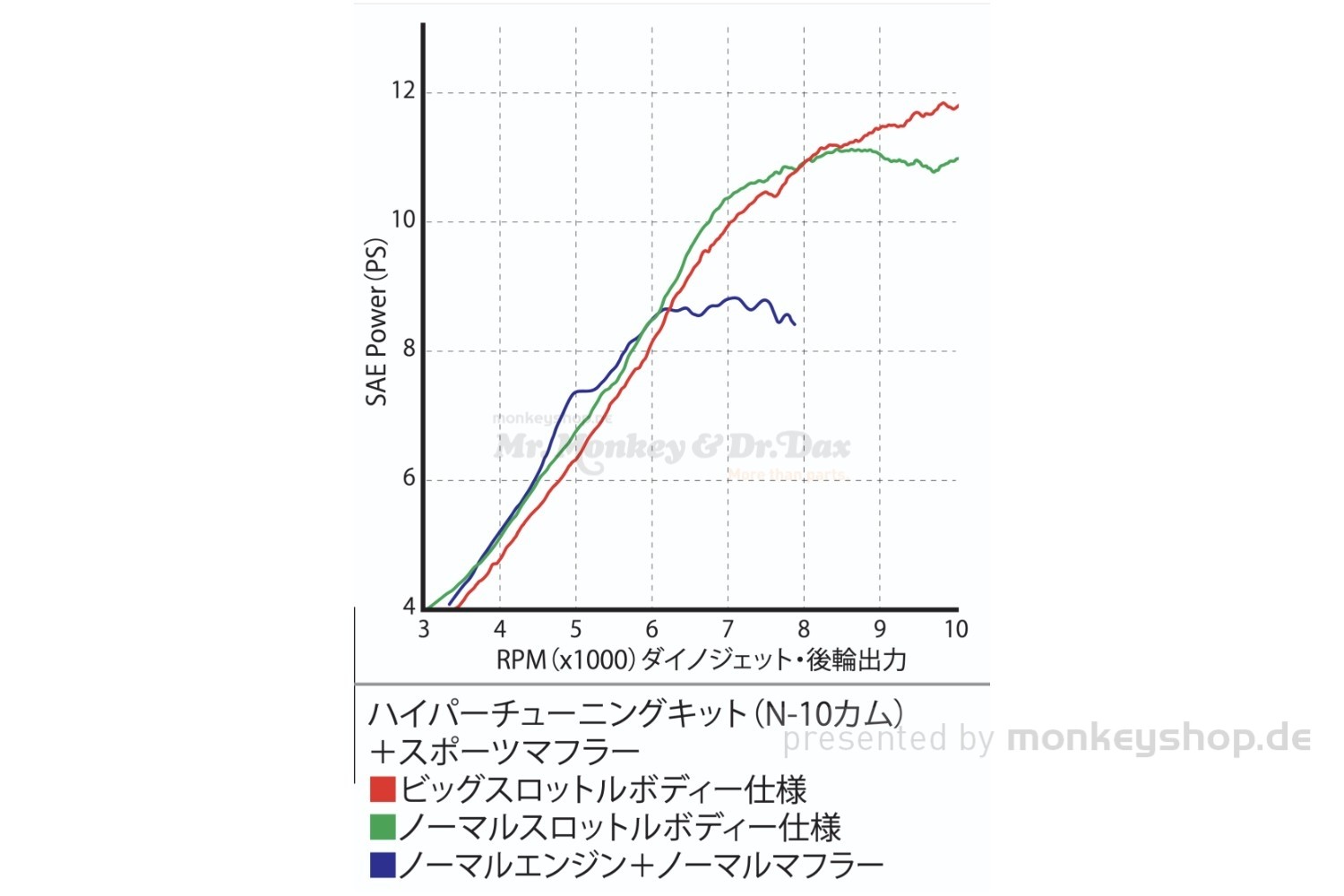 Die blaue untere Kurve zeigt die Serienleistung mit knapp unter 9 PS bei 7000 Umdrehungen.