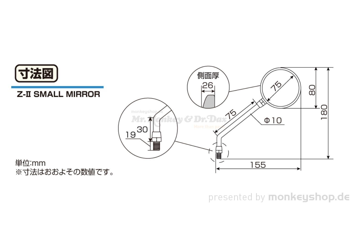 Ein Spiegel Z-II in schwarzer Ausführung von KITACO mit M10 Rechtsgewinde.