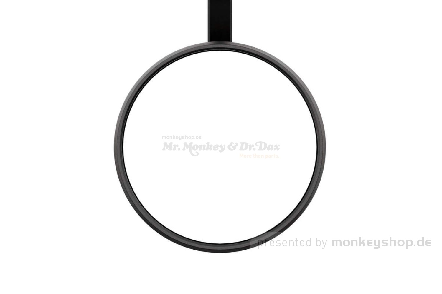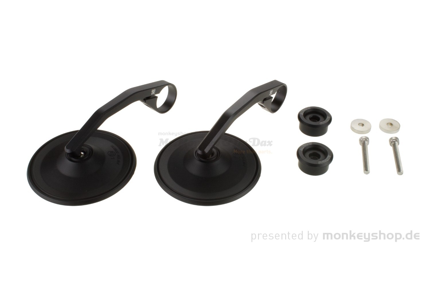 Ein Lenkerenden Spiegel Set "Circula-S" von Shin Yo mit schwarzer Oberfläche in kreisrunder, klassischer Ausführung mit gerader Spiegelaufnahme. Viel bessere Sicht nach hinten trotz klassisch kompakter Optik. Die Spiegel sind e-geprüft.