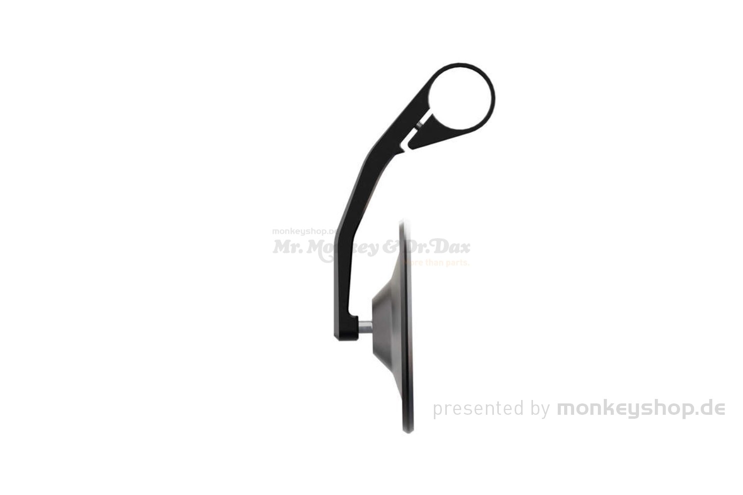 Der aus hochwertigem Kunststoff hergestellte Spiegelkopf erhält über die mattierte Oberfläche ein edles Aussehen, das optisch perfekt zu dem perlgestrahlten und in schwarz matt eloxierten Spiegelstiel aus Aluminium passt. Der Stiel überzeugt mit seiner langen Bauform und ist durch seinen großen Schwenkbereich sehr flexibel in der Anordnung am Lenkerende.
