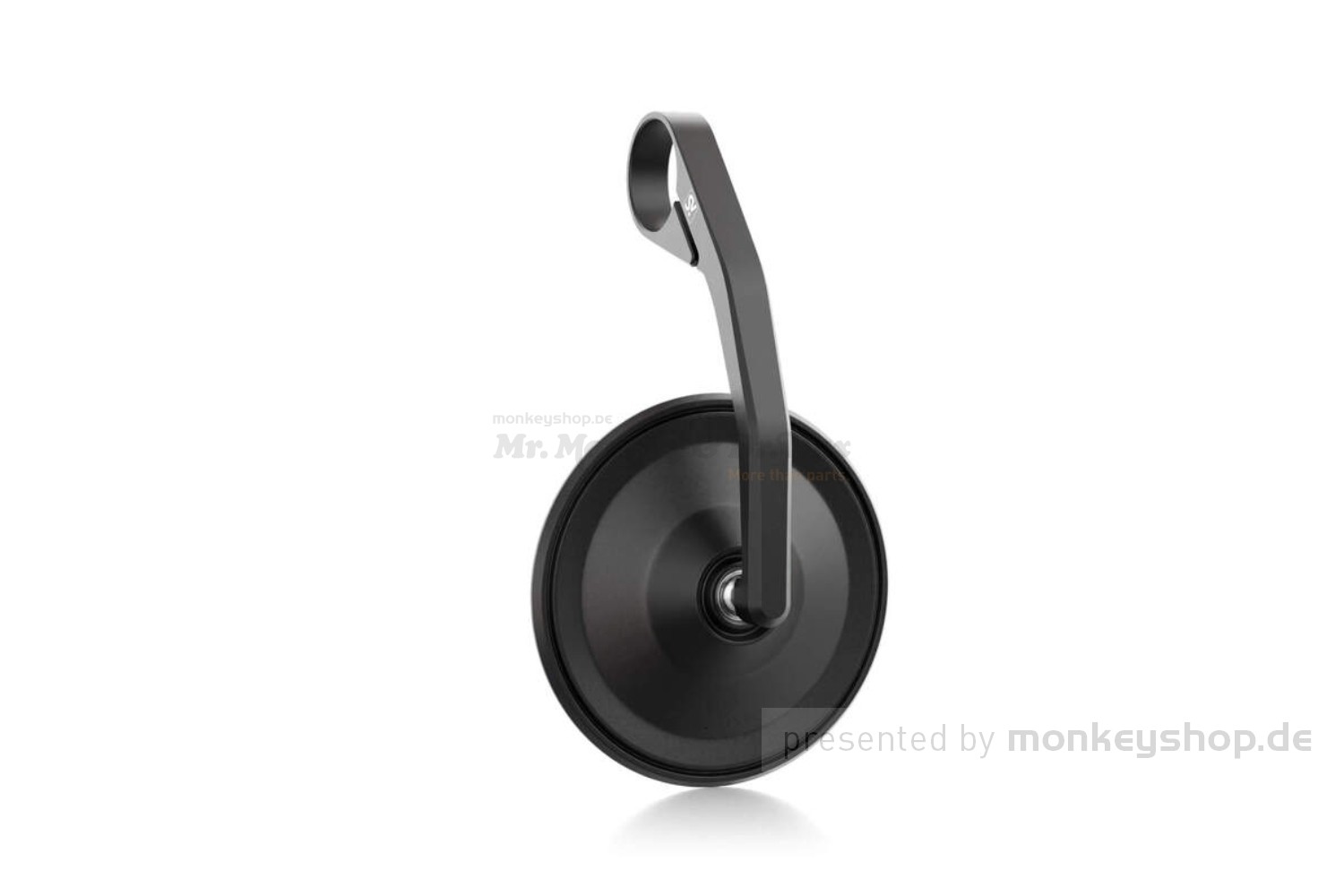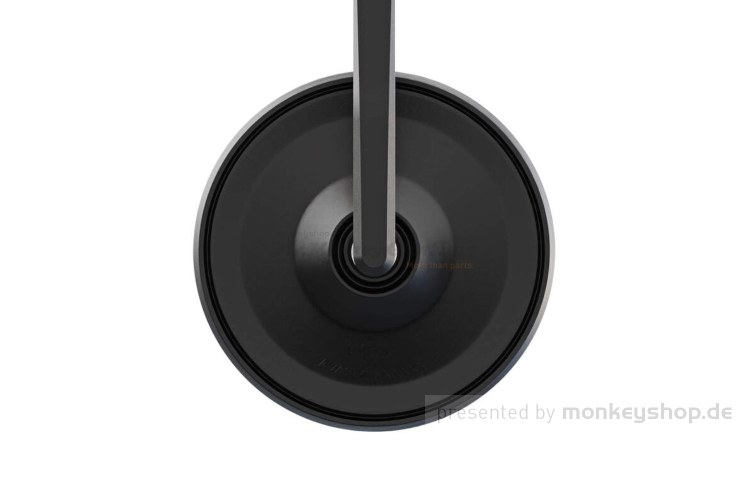 Ein Lenkerenden Spiegel Set "Circula-S" von Shin Yo mit schwarzer Oberfläche in kreisrunder, klassischer Ausführung mit gerader Spiegelaufnahme. Viel bessere Sicht nach hinten trotz klassisch kompakter Optik.Die Spiegel sind e-geprüft.